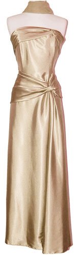 Stunning strapless satin gown with twist detailing, boned bodice, matching chiffon scarf, back zip, junior sizes small to junior plus size 3X. Available in sage green, black, red, fuchsia, gold, dusty blue & blush pink