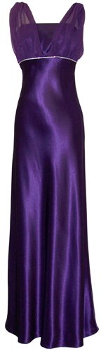 Pretty full length satin dress with spaghetti straps, chiffon overlay and prongset crystal trim. Matching chiffon shawl. Skirt is unlined.
