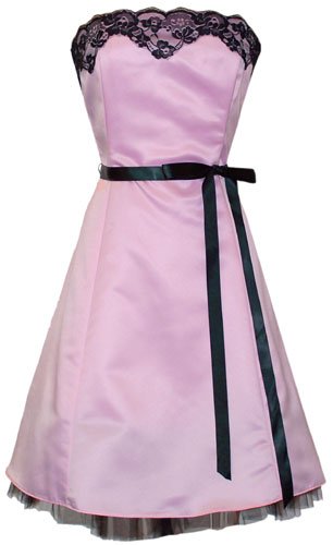 Classic satin strapless cocktail dress with boned bodice, lace trim. Hem hits right above the knee with black tulle peeking out beneath, fully lined, matching satin scarf, sew-in spaghetti straps included, zip back. Junior plus sizes XS-3X.