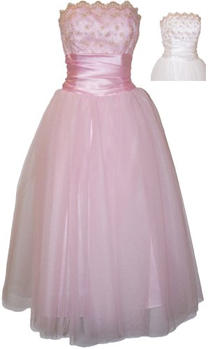 Gorgeous satin & tulle gown with gold embroidery on the bodice. Boned bodice, fully lined, zip back. Great for prom, formal event or informal bridal gown. Includes matching satin shawl & straps (straps not attatched). Junior sizes XS-3X.