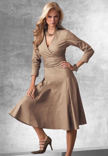 Stretch poplin shirtdress by metrostyle® with mock-wrap styling. ¾-length, French-cuff sleeves. Imported. This season's must have designer-inspired dress!Surplice front, seamed for a great shape fitted into a flattering full skirt!Cotton/spandex; machine wash. 28 from waist.Misses