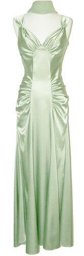 Stunning one-way light stretch satin gown with gorgeous ruching in front and back, matching chiffon scarf. Junior sizes S-3X.